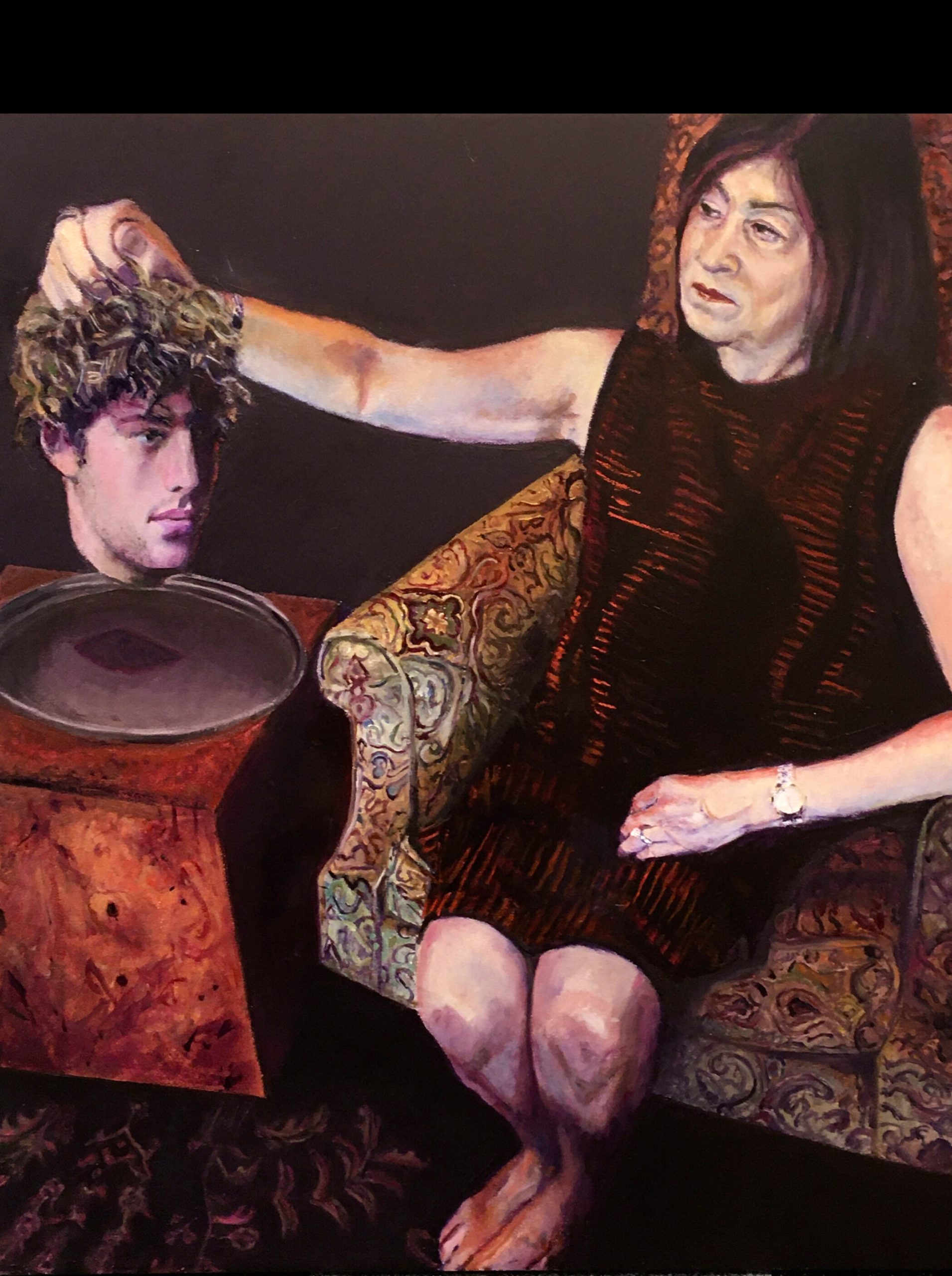 Judith and Holofernes The apocryphal story of Judith and Holofernes accounts how the beautiful Jewish widow is invited into the tent of Holofernes, an Assyrian general preparing an attack on the Jewish town of Bethulia. She decapitates the general, who is in a drunken sleep, and consequently saves her town, sending the Assyrians fleeing. Many Renaissance and Baroque artists painted Judith and Holofernes, including Cranach the Elder, Mantegna, Caravaggio, and the iconic version by Artemisia Gentileschi. Contemporary artists painted the highly dramatic story as well, including Gustav Klimt and Kehinde Wiley, who painted a black Judith and a white Holofernes. Fenton’s version brings the story into contemporary times and flips the storyline to make Judith a senior citizen and Holofernes an Adonis-like young man, leaving the viewer to contemplate the psychological reasons for themselves. Description
