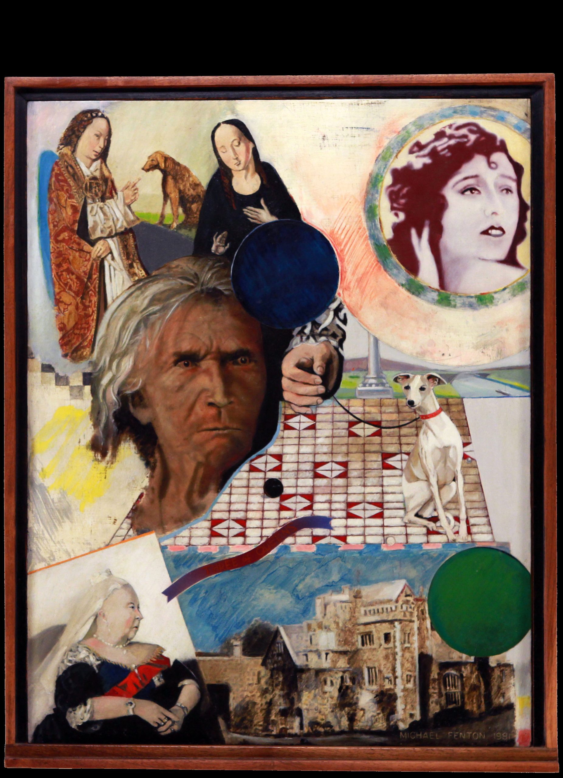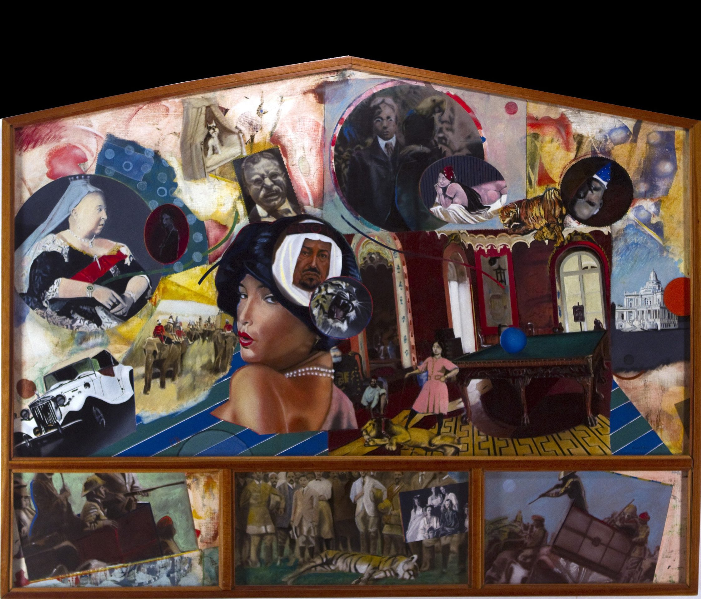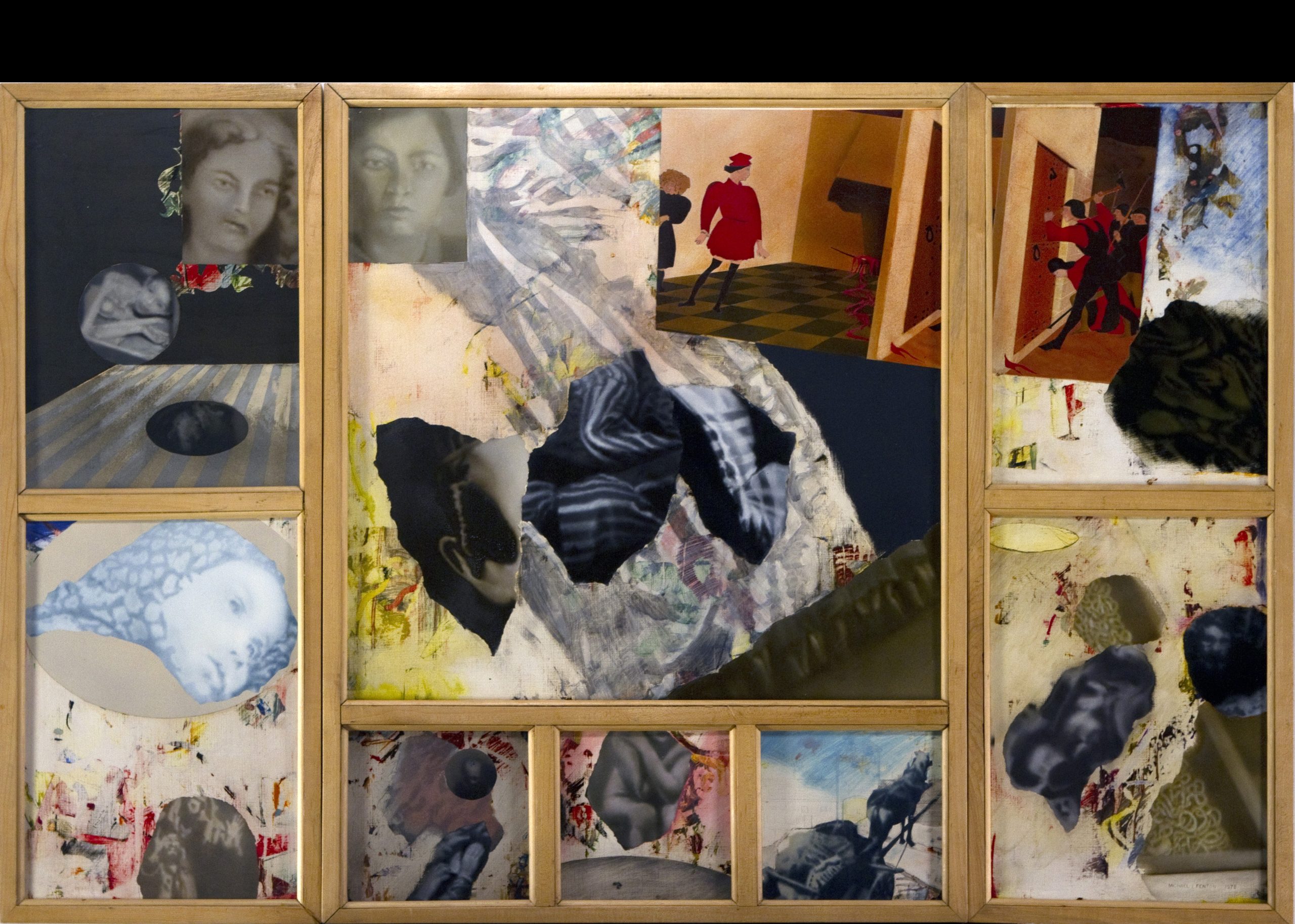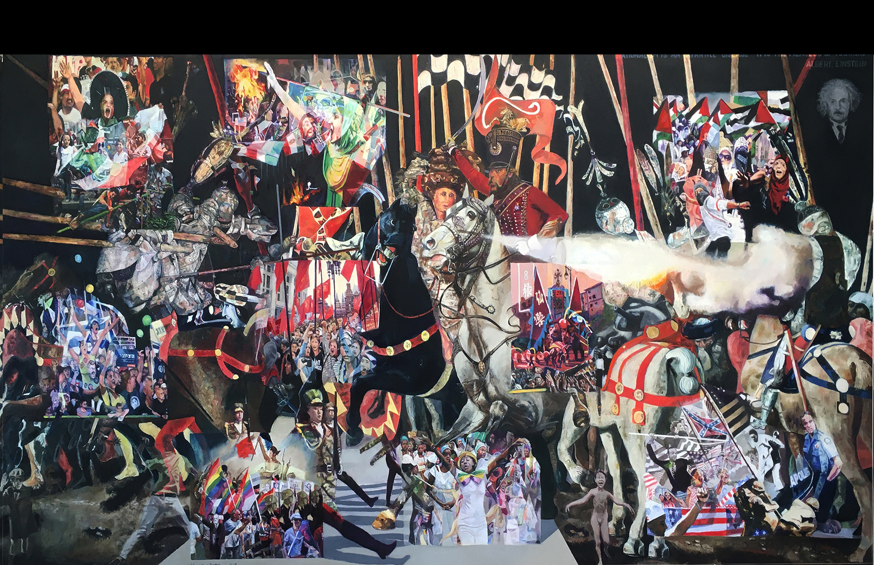 Fenton's composition draws from Paolo Uccello’s The Battle of San Romano and Edouard Detaille’s Vive L'Empereur, depicting warriors in fantastic headgear. Fenton combines images like a napalm-burned Vietnamese girl and a black man attacked with an American flag to create new meanings.