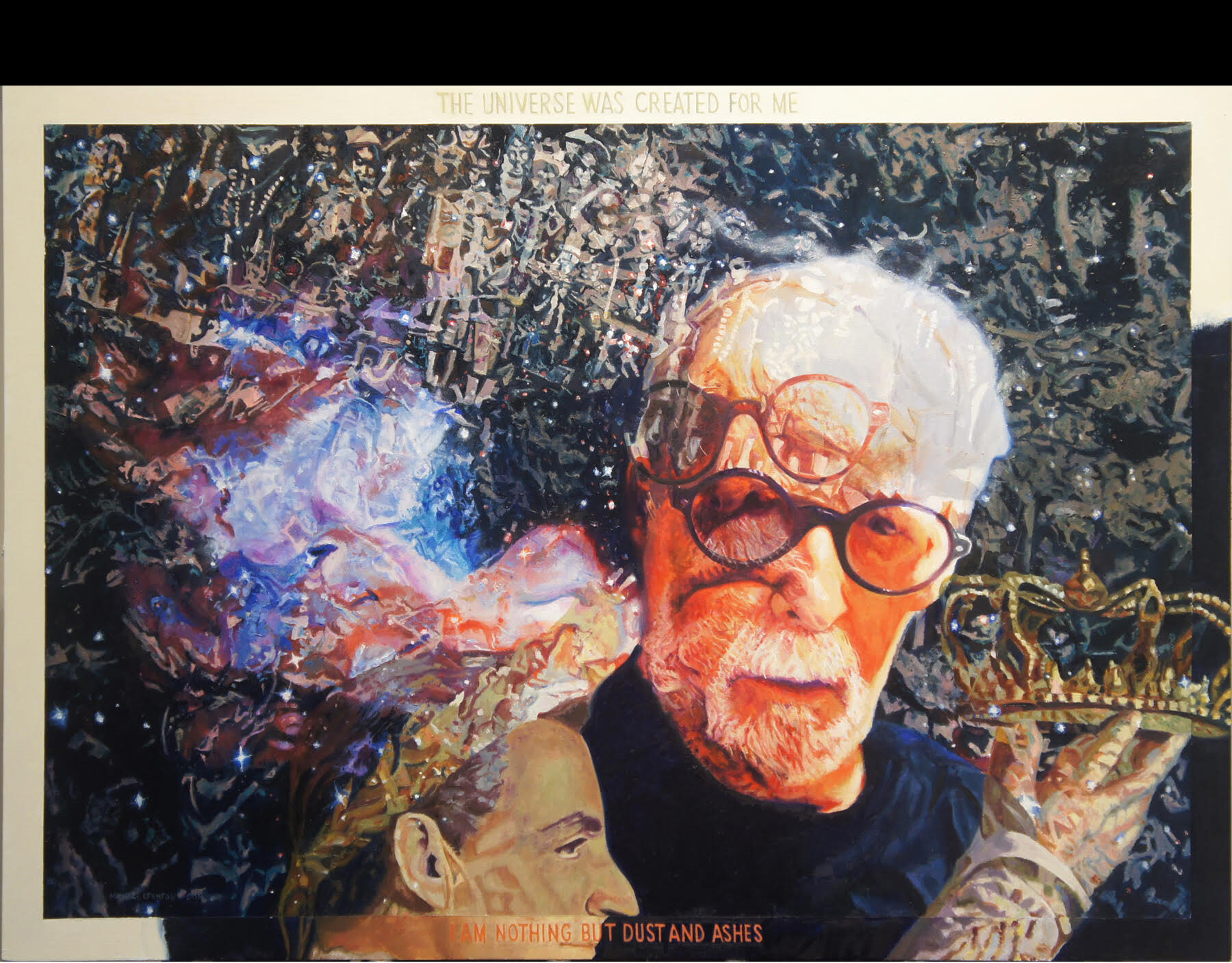 The Universe Was Made For Me; I Am Nothing But Dust And Ashes An 18th-century Polish rabbi, Simcha Bunim, wrote, “For my sake the world was created; I am nothing but dust and ashes.” The artist, contemplating the rabbi's remarks, came to the conclusion that his words were extraordinarily profound. This dichotomy allows people to do great things and still be altruistic to their fellow human beings. Balance was the key which allows one to go through life with as few regrets as possible and still be a decent human being. In his painting, Fenton has Napoleon crowning himself Emperor of France while simultaneously seeing Somalian children dissolving into dust and ashes. Fenton portrays himself in double portraits, depicting the juxtaposition of extremes. Description