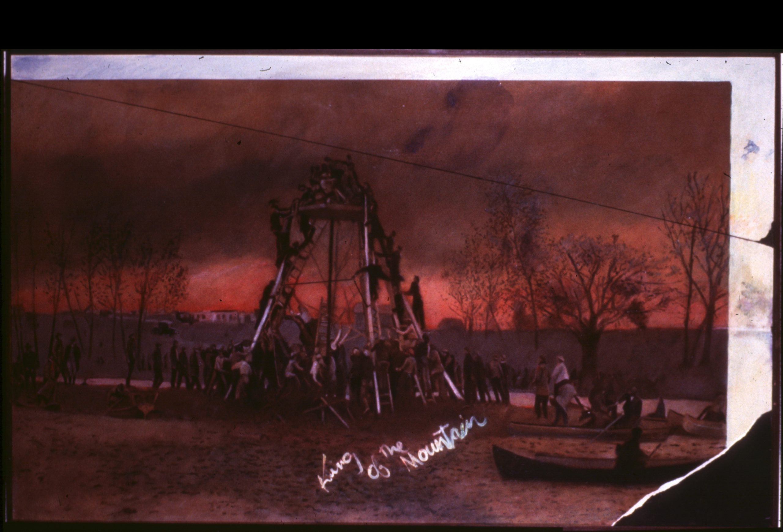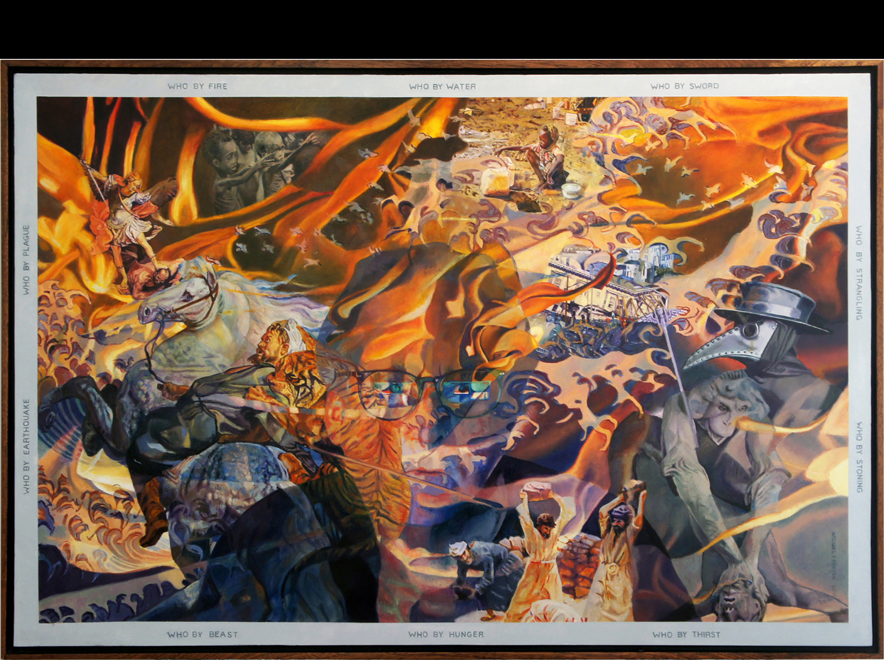 Who by Water, Who by Fire... The concept of this painting came from a 1200-year-old prayer which suggests who will live and who will die, and those that die before their time succumb to a litany of possible deaths. The prayer ultimately suggests that repentance, prayer, and charity will temper the severe decree. The prayer started to resonate with the artist when he faced his own mortality and thought, Who by Fire, Who by Water, and Who by Thoracic Aneurism. Description