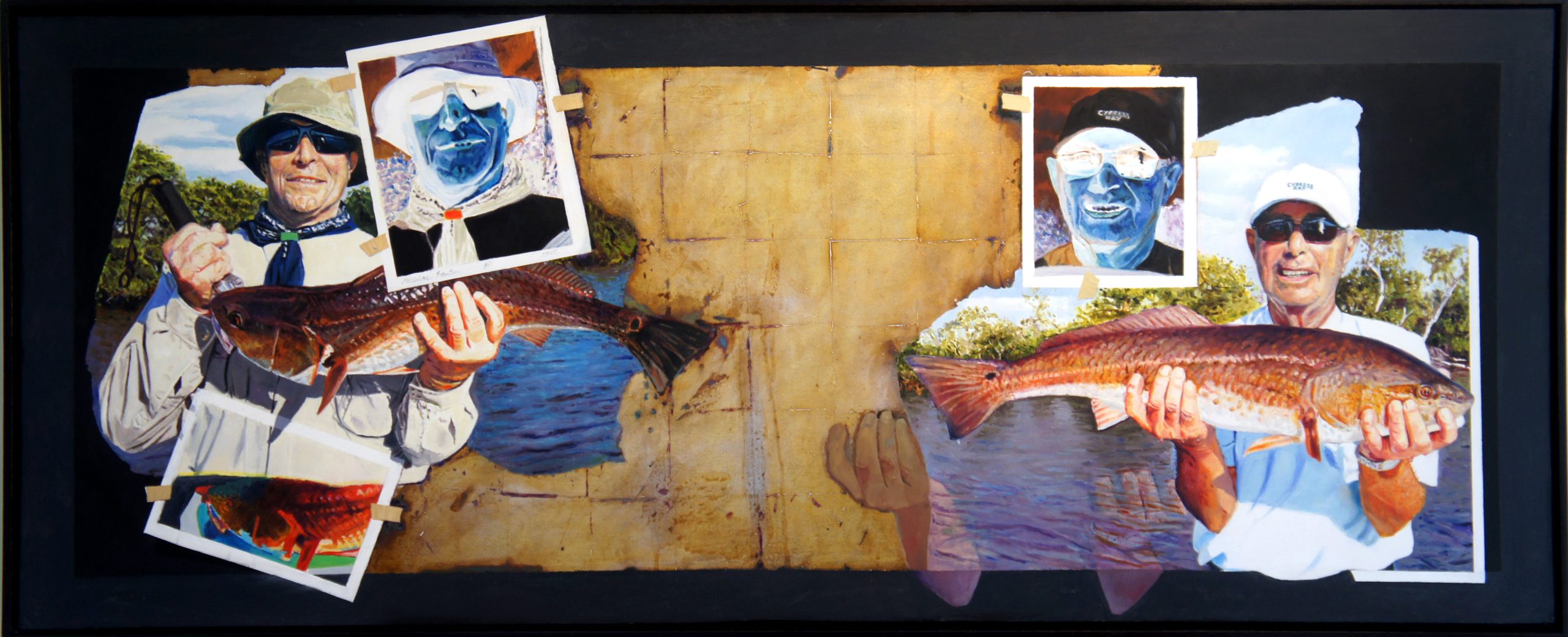 Larry and Carl A fisherman holding his catch is a ubiquitous photographic image. Fenton chose to paint the subject to create something unique from the most banal of images. His use of metal leaf suggests something regal or religious . . . or possibly both. Using trompe l’oeil, Fenton paints taped negative photographs of fishermen as if he were painting from those negatives. Description