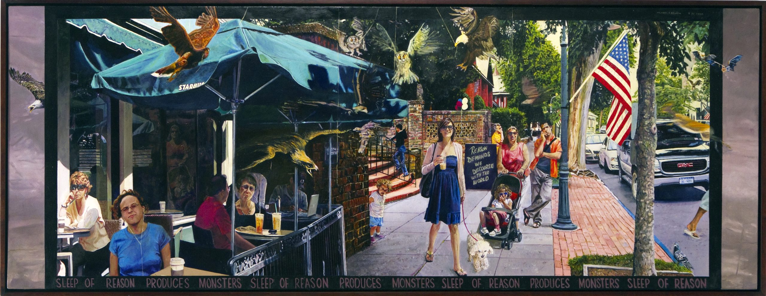 After Goya: Sleep of Reason Produces Monsters Sleep of Reason Produces Monsters: This painting requires a little history. In 1797, Goya began a series of prints, Capriccios, in which he was critical of Spanish culture, avarice, greed, and the political climate that fostered it. Goya believed reason was asleep, and Fenton believes we too are asleep. Many of us are so involved in our little worlds that we fail to see all the problems that are descending upon us en masse. We are not talking to our enemies while conducting war and producing still more enemies; we are giving our freewheeling, well-greased economic machine a blind eye and a blank check; our powerhouse auto industry is producing energy-inefficient cars that are increasingly unwanted; we are damaging our environment by ignoring global warming; and we are ignoring the needs of the medically uninsured, contributing to skyrocketing medical costs. All the while, North Korea is building and testing nuclear weapons, and Iran is doing the same and threatening Israel. In Fenton’s painting, most of the figures are self-absorbed in their own world, with the exception of the little girl (Fenton’s granddaughter Leila), who is peeping around the corner. The little girl is in the process of expanding her world, and her image suggests that hope is around the corner when the predator birds are descending. Her awareness is the inspiration for this painting and our hope around the corner as well. Description