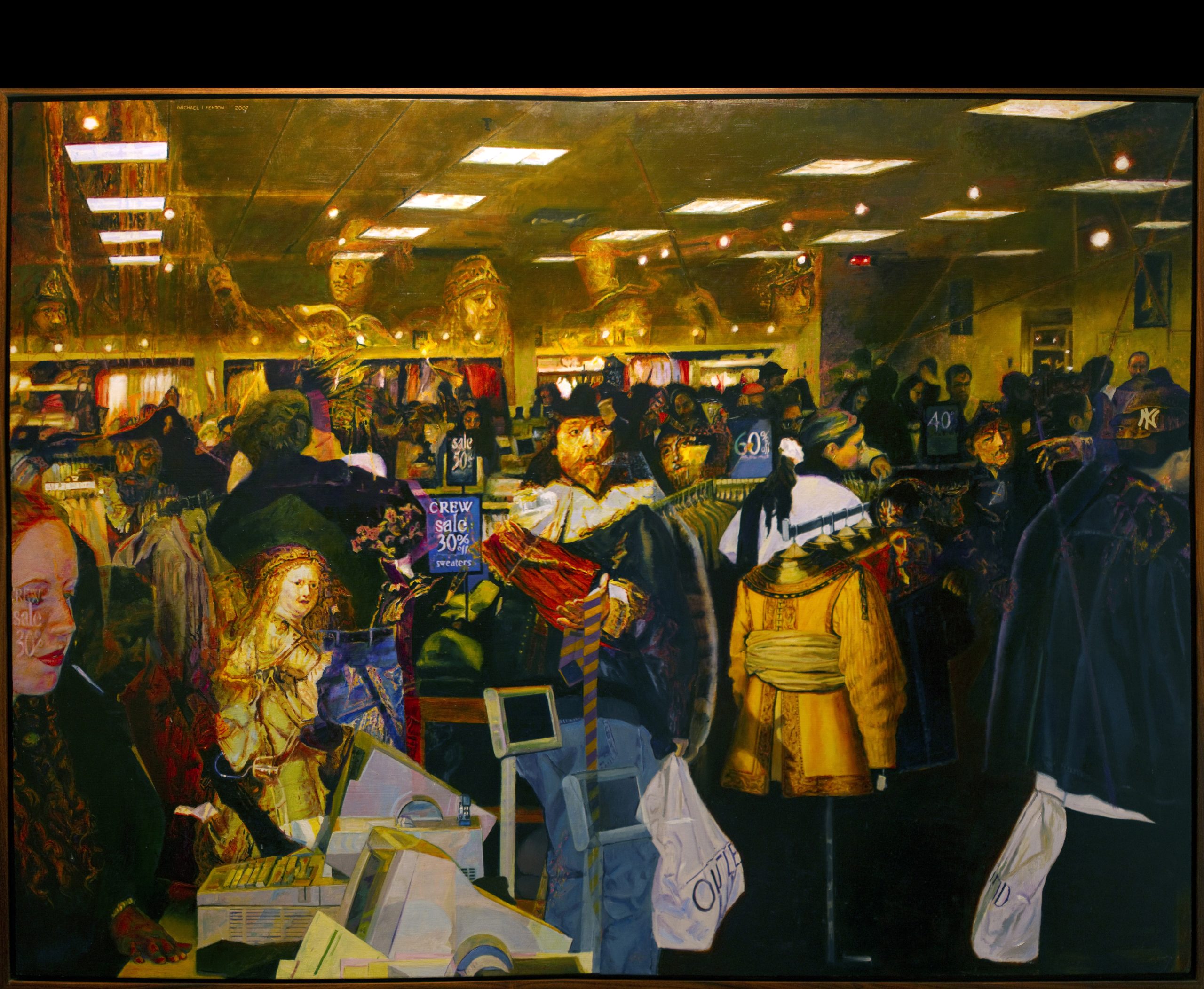 Gilgulim -Night Sale Fenton has always admired Rembrandt’s Night Watch but felt that the elegantly dressed soldiers were less militaristic than one would expect. Perhaps the well-dressed soldiers would feel more comfortable shopping at J.Crew than guarding the gates of Amsterdam. Gilgul transmigrates them into the busiest shopping days at J. Crew. Description