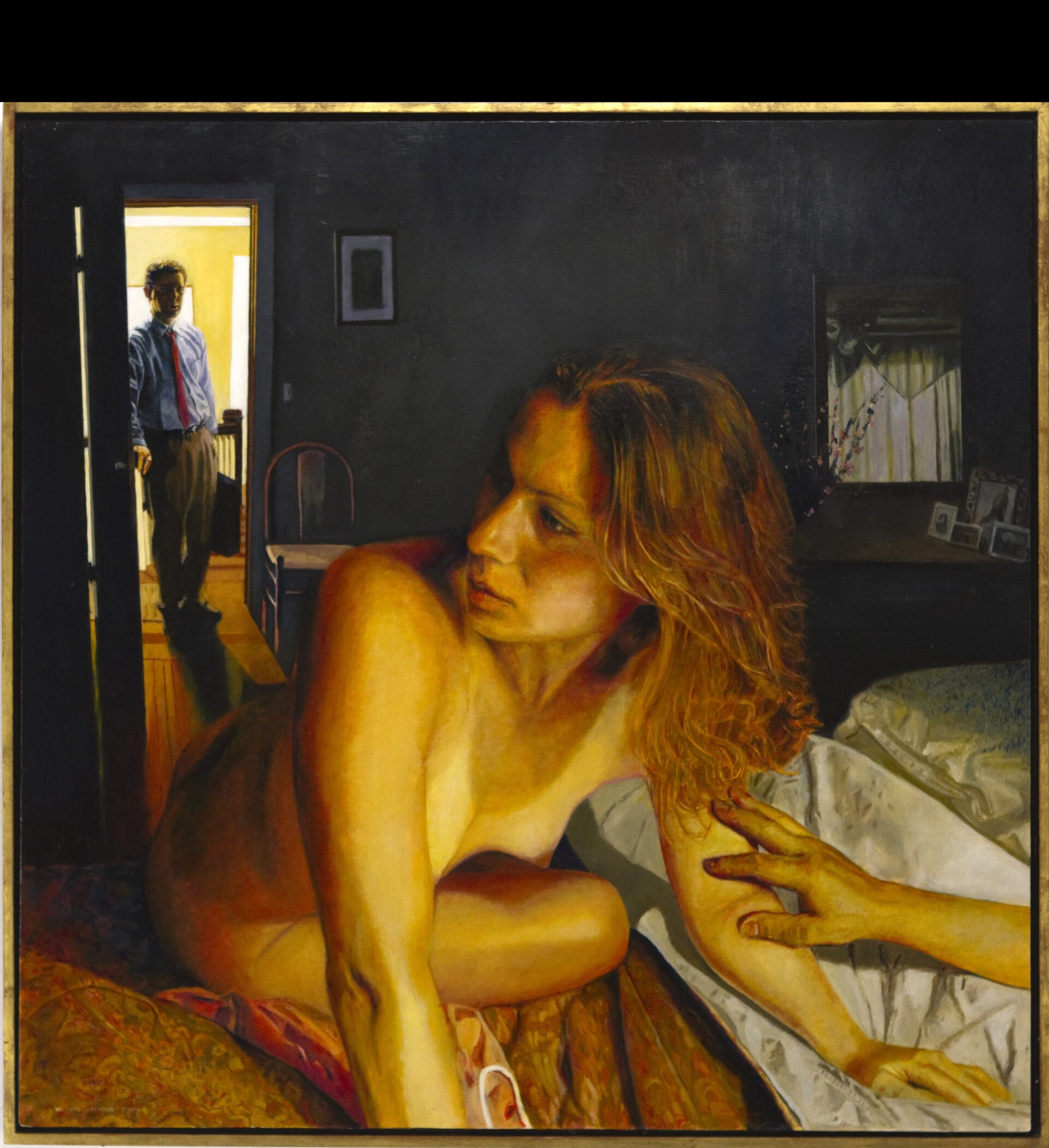After the Scream In the midst of his middle-class life, the nude figure curls up on a sofa almost in a fetal position. He emotes a feeling that is best depicted by Edvard Munch in the painting The Scream. A copy of The Scream hangs over the fireplace. Fenton suggests that the social isolation and the resulting melancholia cause the colors of the figure’s environment to intensify and distort as the nude figure contemplates his life. Description