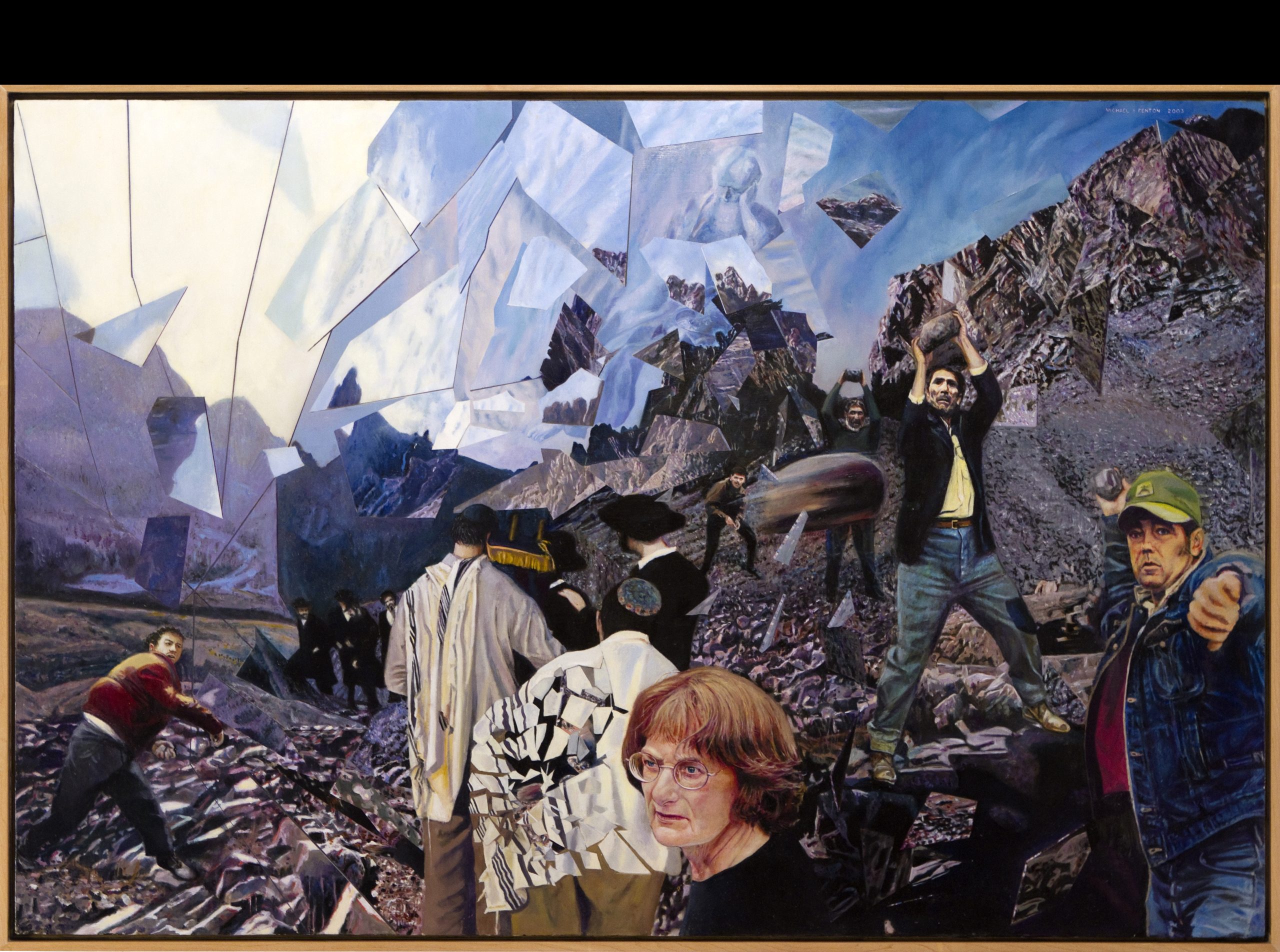 Laminations of Jeremiah Fenton describes people throwing rocks at Jews whom they have been taught to hate. In the process of their actions, they fracture the world, a world in which the highest moral standards are the bulwark against destruction. Even so, the Jews fracture as easily as the world. The weeping prophet Jeremiah witnesses all from his vantage point between the layers of the broken world. Description