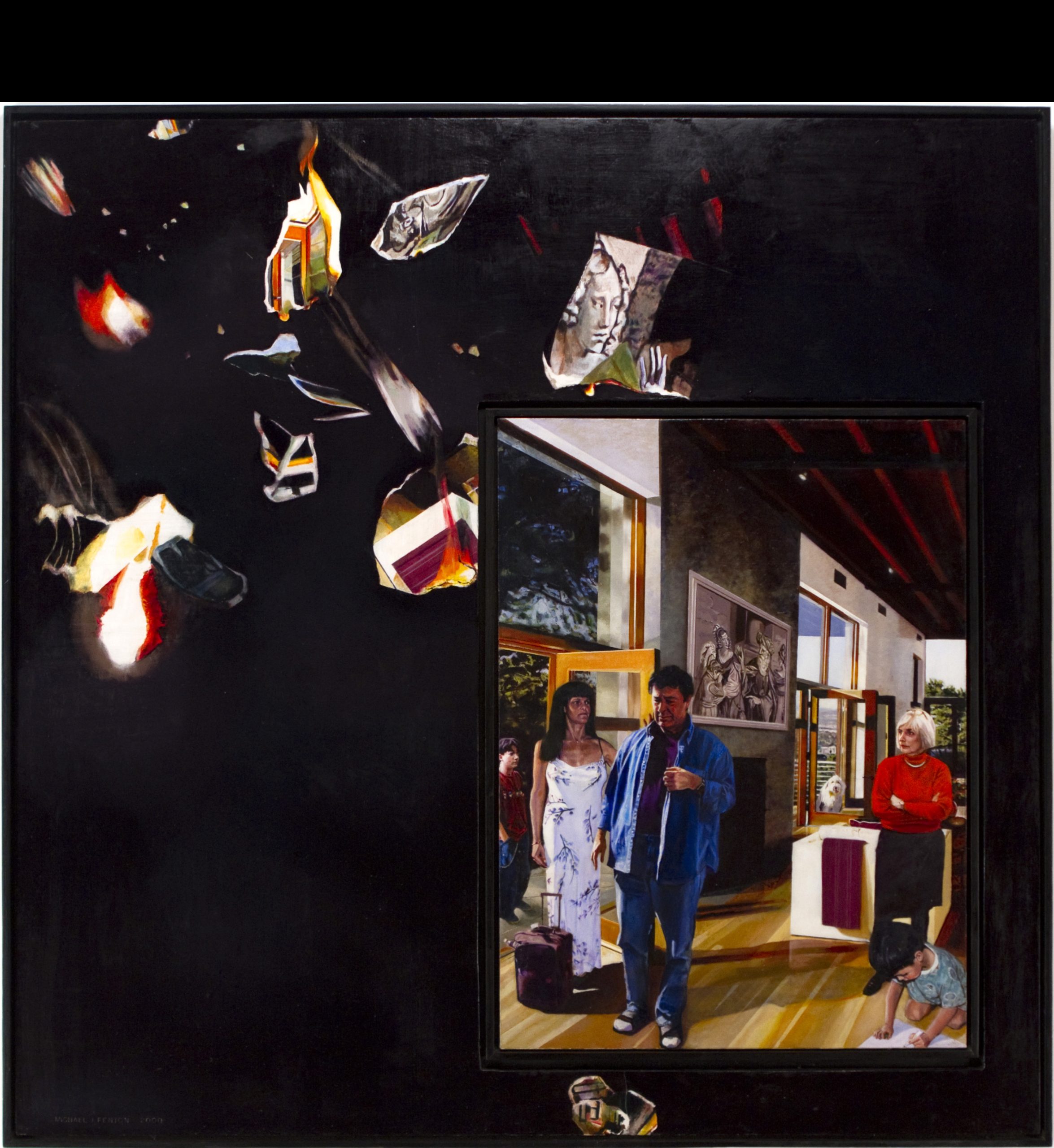 The Selling of the Golden Calf In Exodus, the golden calf was a false god created by the Israelites while Moses was on top of Mount Sinai receiving the Ten Commandments. As punishment for such idol worship, the Israelites wandered in the desert for forty years. In this painting, Fenton draws a parallel between the Biblical golden calf and the idolatry created and encouraged by contemporary consumerism, leading to the metaphoric desert of our own making. Fenton references Rembrandt’s Moses with the Table of the Law as a contemporary ghost, smashing the tablets in reaction to our new idolatry. Description