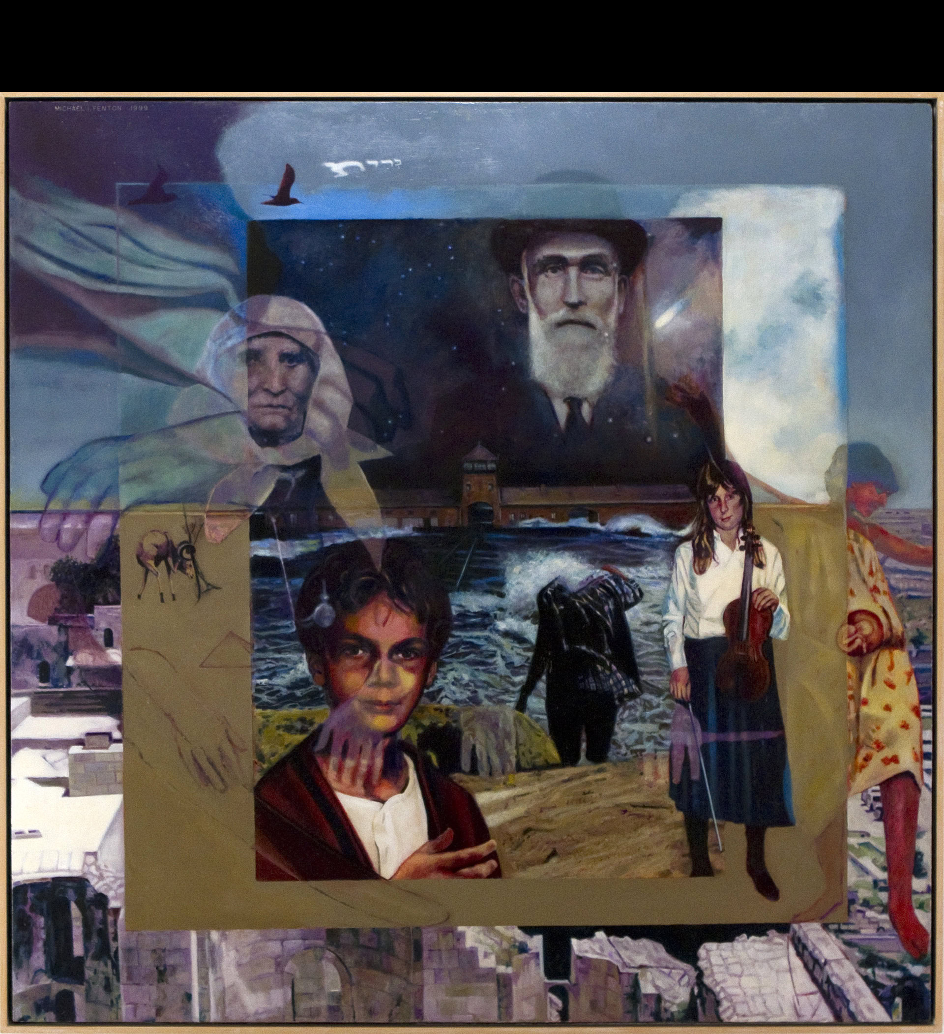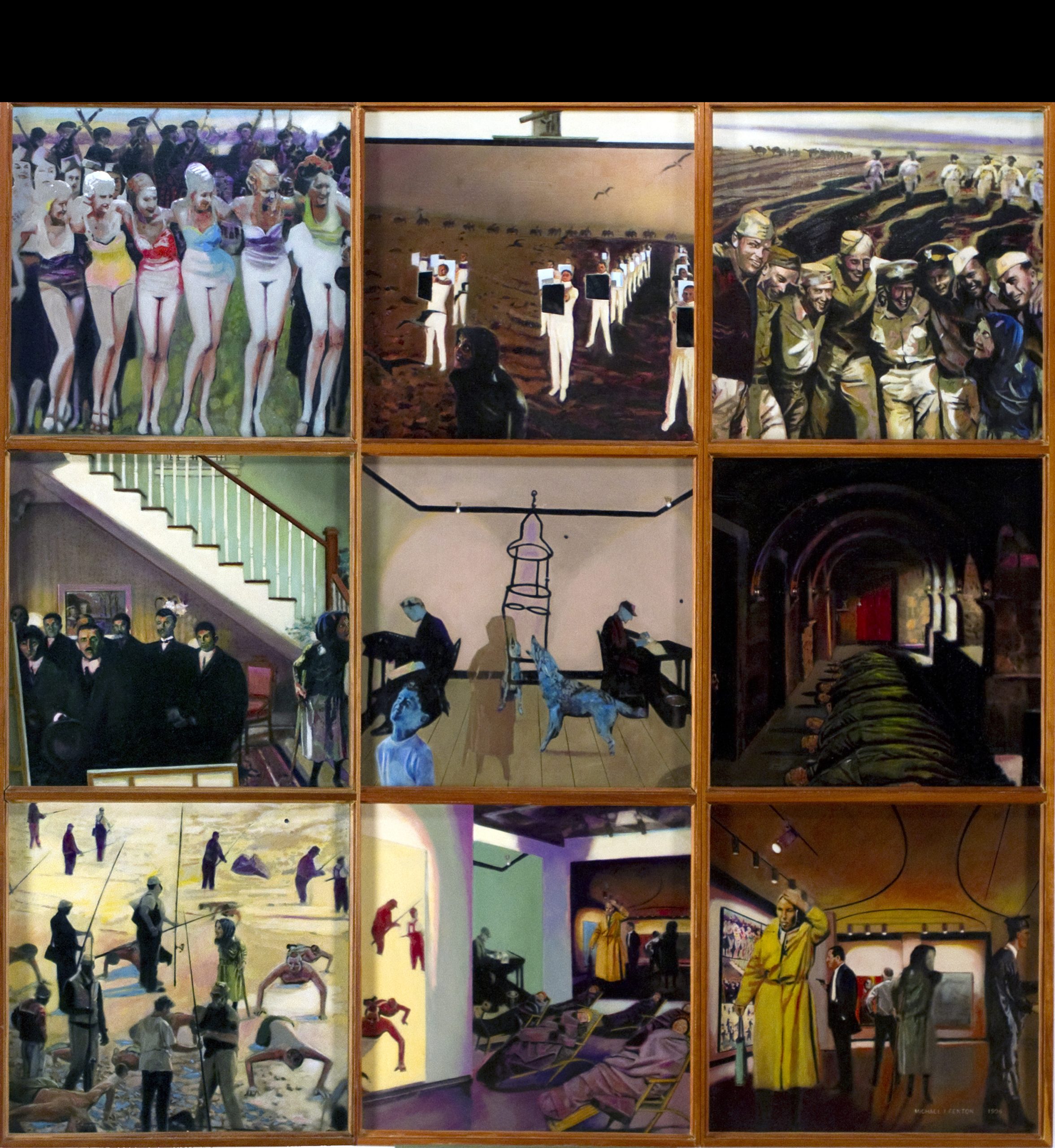 Gilgulim Reunion and Fugue at Poussin Beach Through the Kabalistic concept of Gilgul (im pl), which is the transmigration of souls through time, Fenton adapts Nicolas Poussin’s Rape of the Sabine Women and weaves it through a banal scene at Jones Beach. Fenton creates high drama just under the surface of an ordinary beach scene or lurking myth interacting with absolute reality. This fugue, with its psychological and musical meanings, becomes the focus of this work. Description