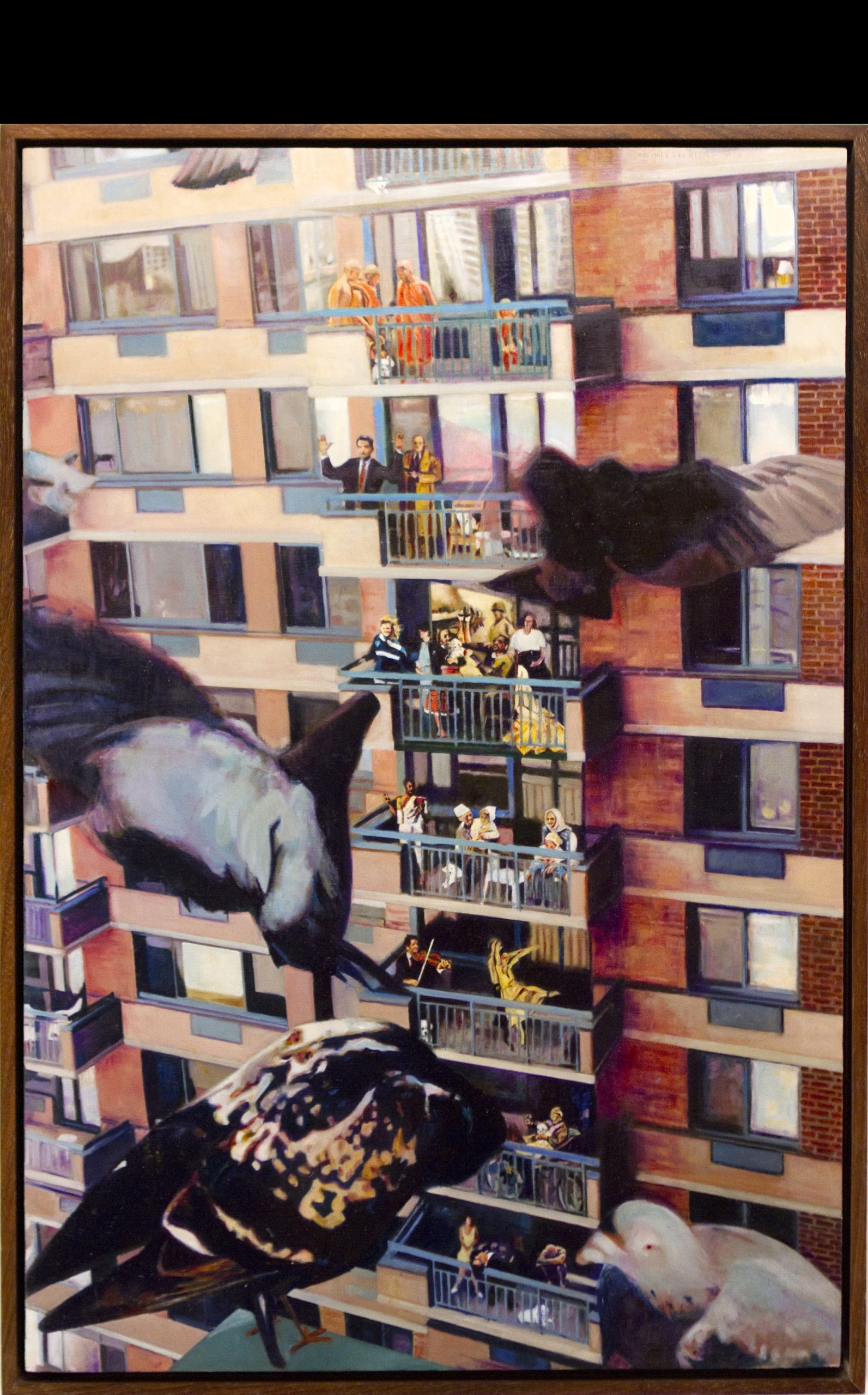 Bird House The genesis for this painting was sparked by the artist’s visit to his daughter’s apartment in New York City. Gazing out from her balcony, he constructed imaginary life stories unraveling on the stacked balconies in front of him. All the balconies suggest separate existential lives, which the pigeons have the clearest view. Description