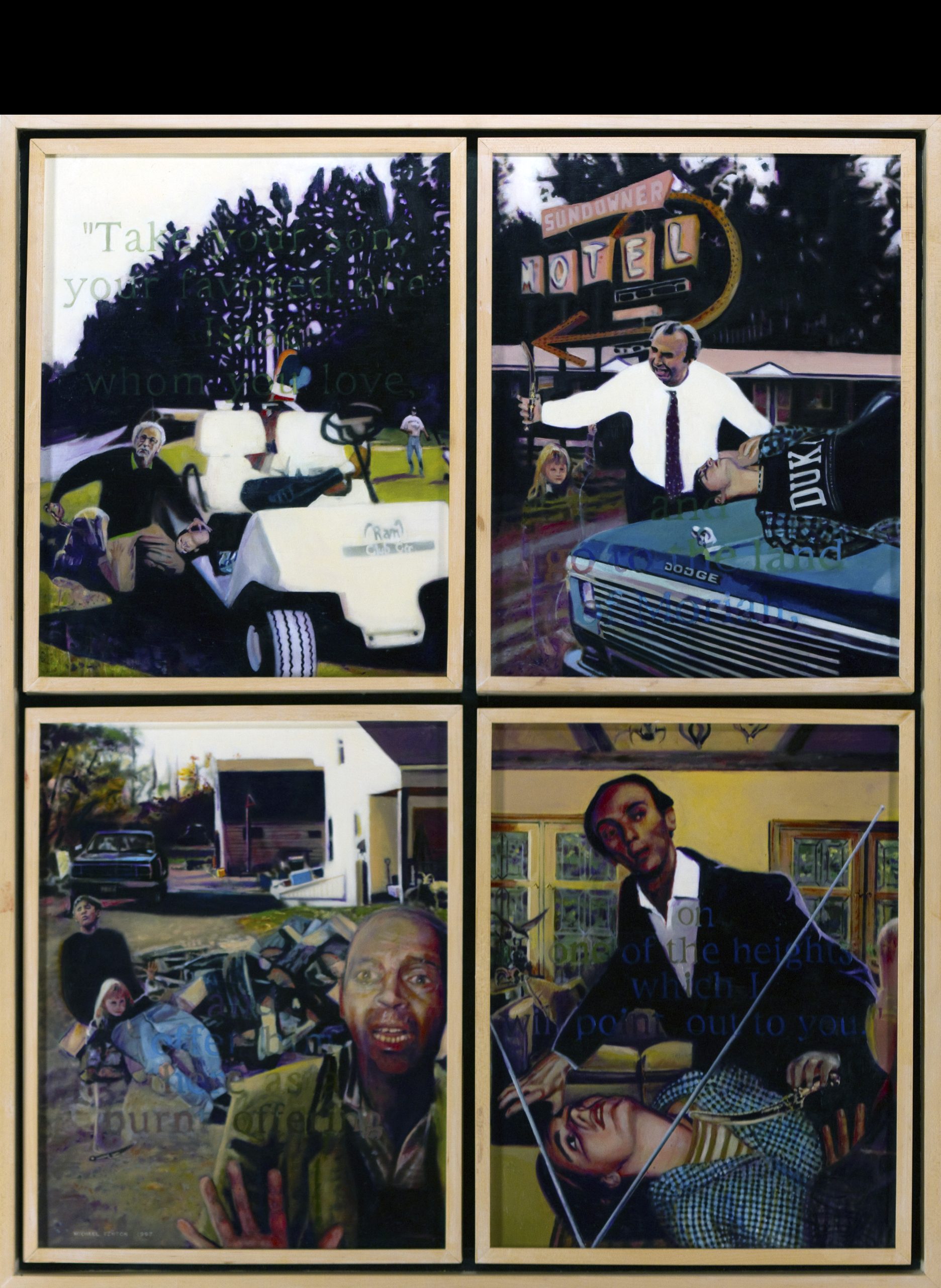 Akedah-The Binding of Isaac The Binding of Isaac (Akedah) found in Genesis is retold as a contemporary story of popular culture’s sacrifices of children. Each panel dramatizes the moment in which the angel stops Abraham from sacrificing his son. God provides a sacrificial ram as a substitute for Isaac. A metaphoric ram and other visual metaphors are used in each panel to help dramatize and draw parallels from the Biblical story to the present. Description