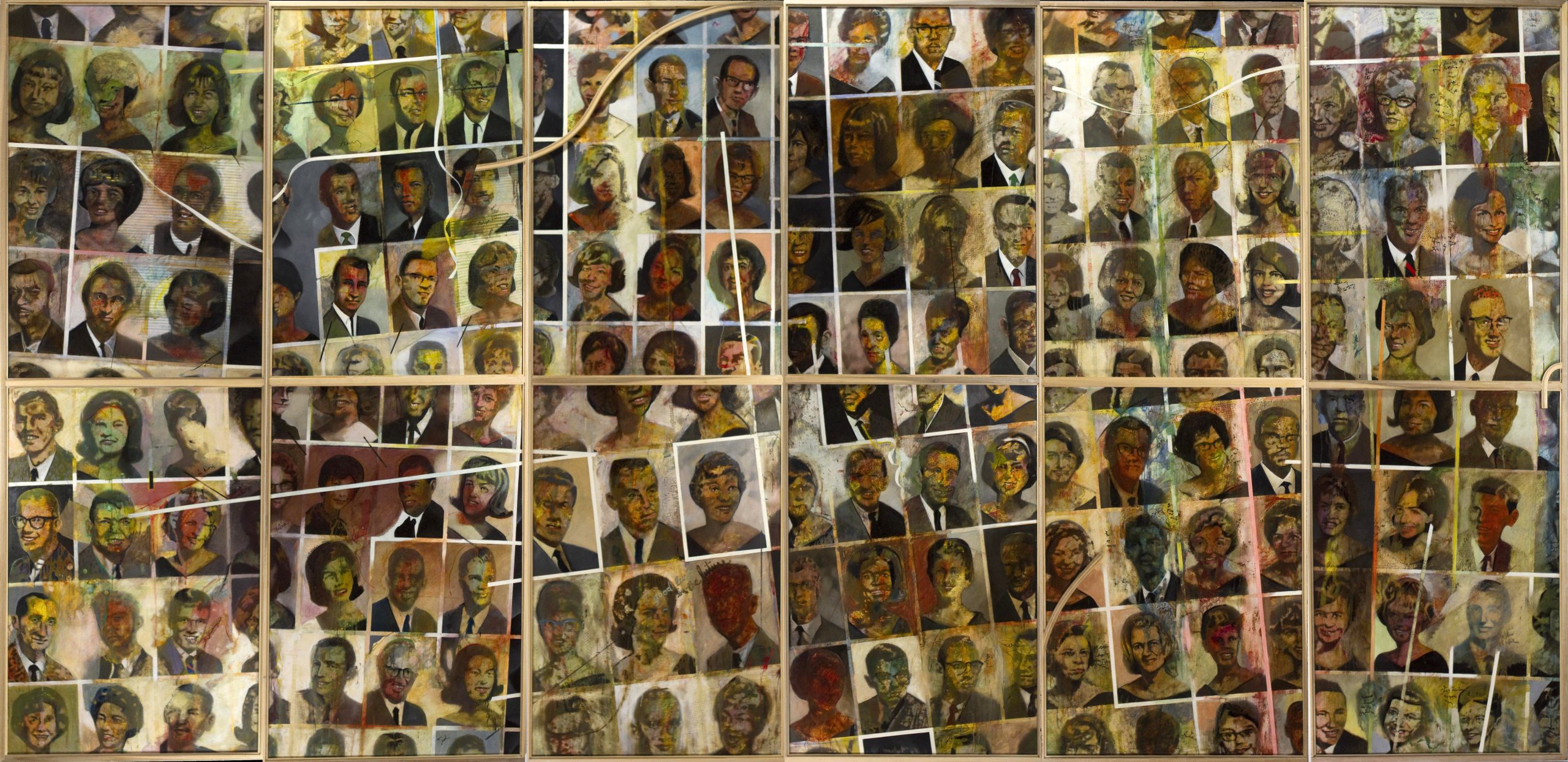1965 Ohio State Buckeyes This painting was inspired by an Ohio State University yearbook. The twenty-two-year-old graduates, including the artist with their flat tops, bouffants, and flips, were optimistically ready to leave their student realm and enter the real world to make their mark. These graduates are now parents, and their own children are optimistically facing life as the graduates once had done. How quickly time passes and how speedily lost is our youthful idealism. Description